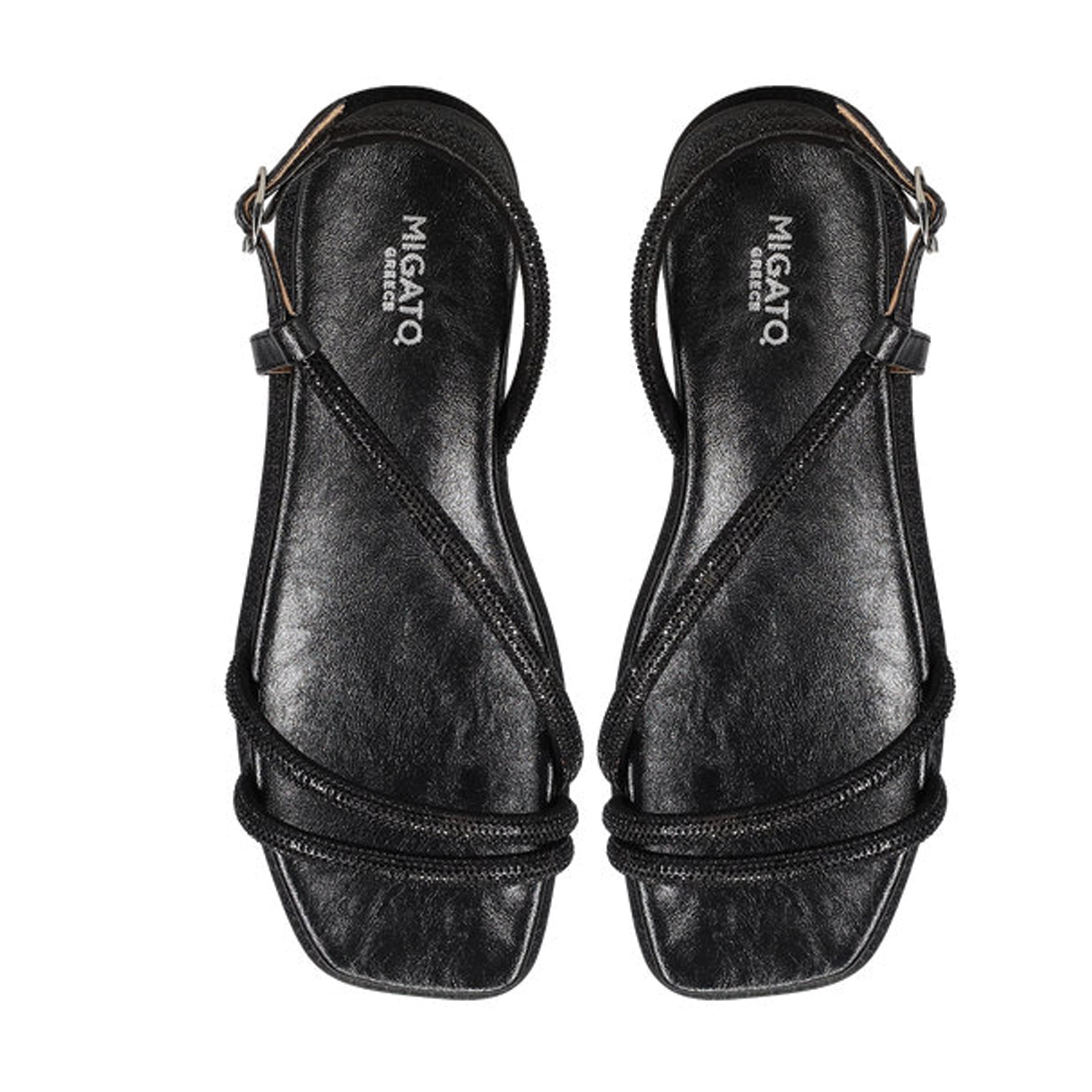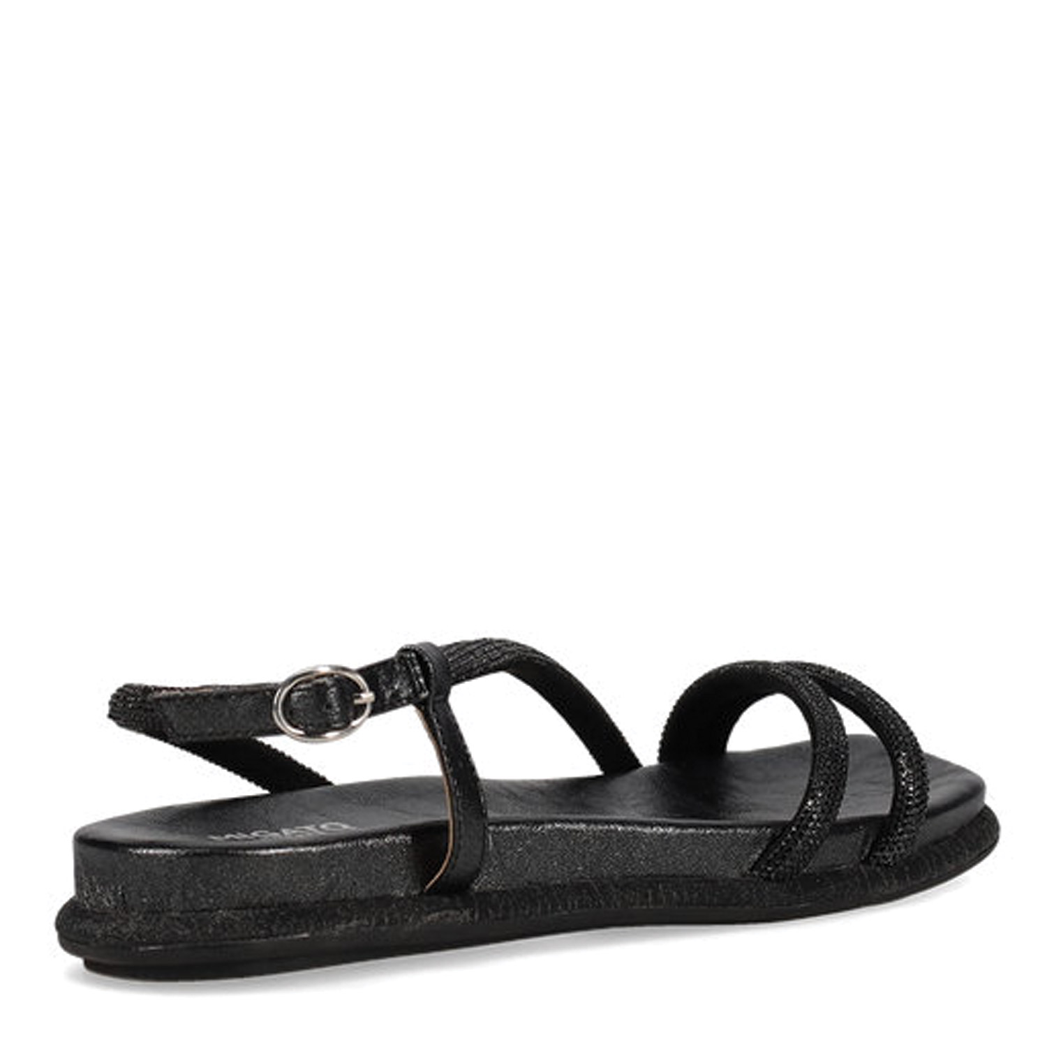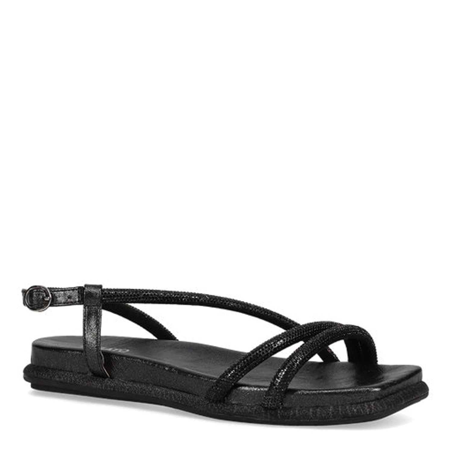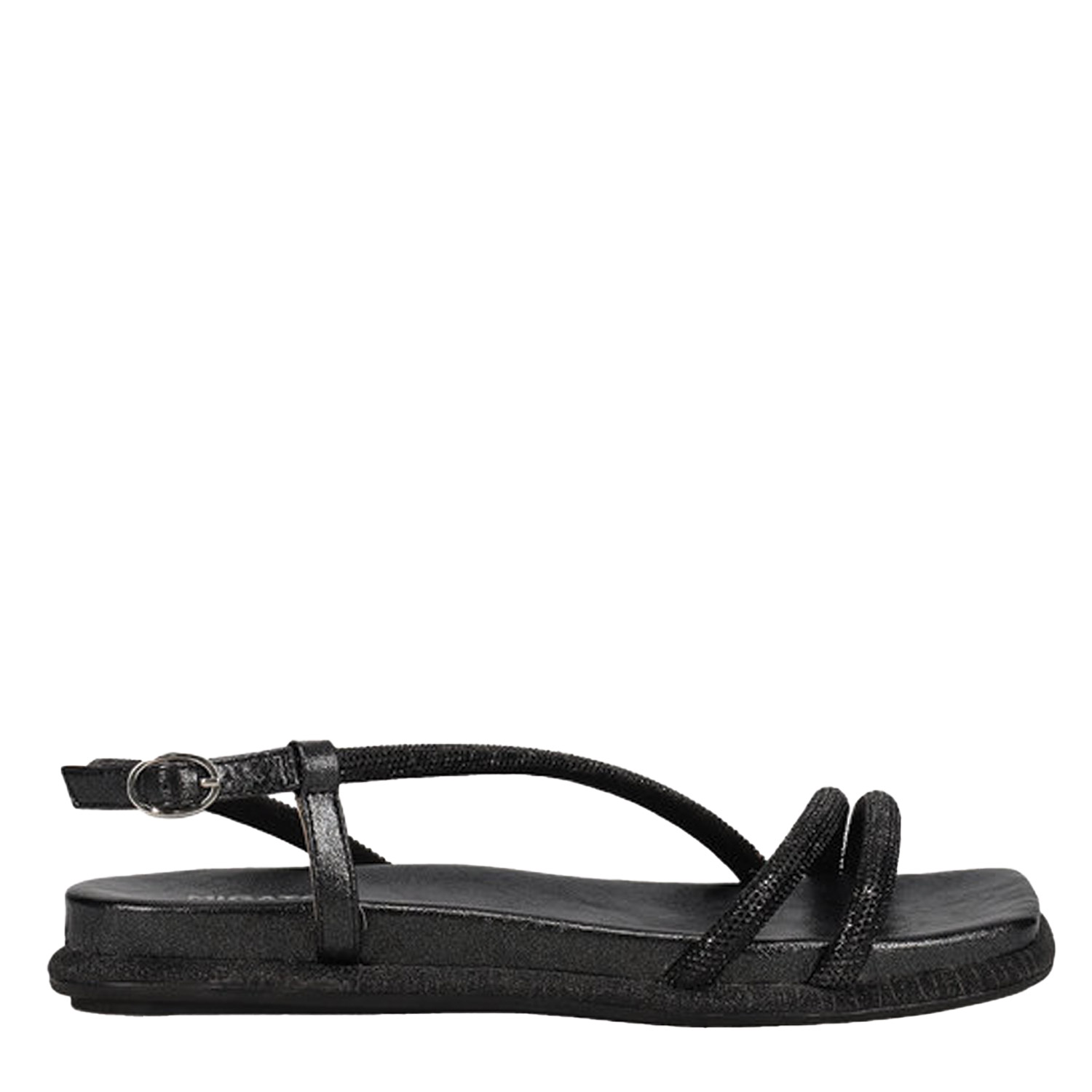Μαύρο footbed σανδάλι. Διαθέτει λουράκια διακοσμησμένα με στρας. Δένει με ρυθμιζόμενο λουράκι αστραγάλου.