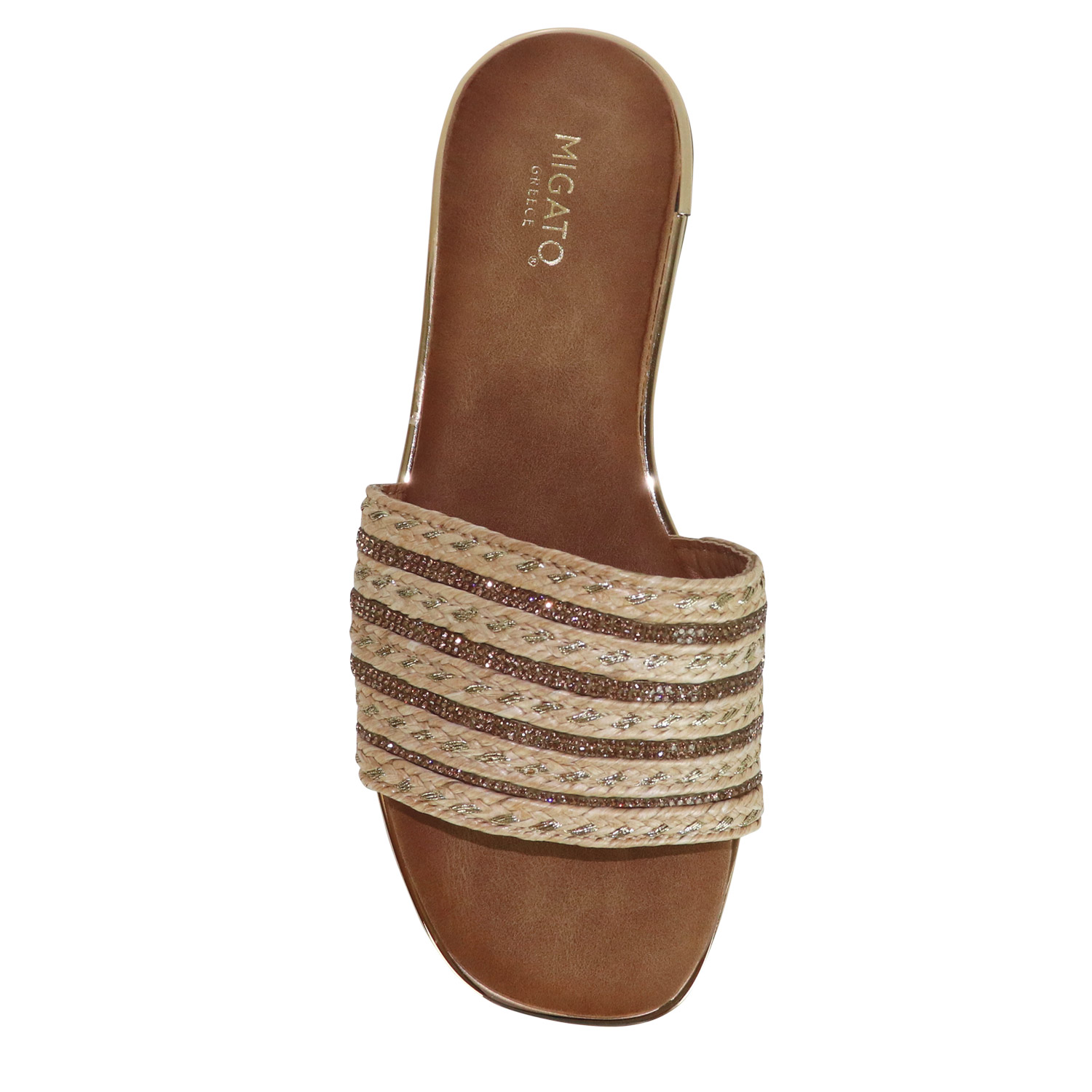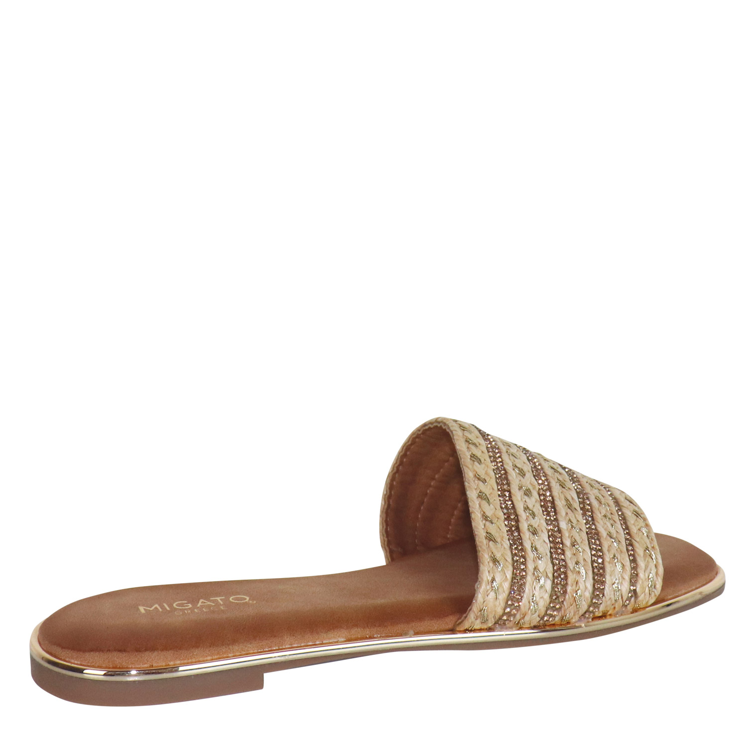 Migato γυναικείο σανδάλι, σε ταμπά χρώμα, κατασκευασμένο από ύφασμα. Ύψος τακουνιού 1εκ.