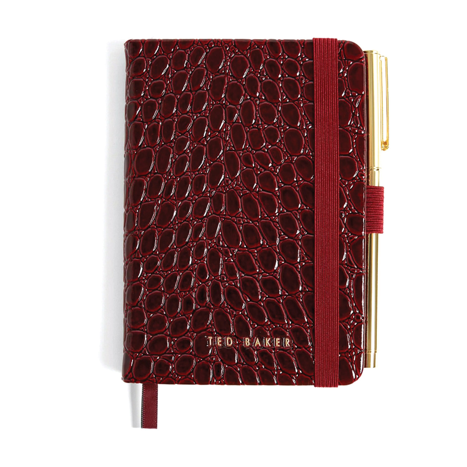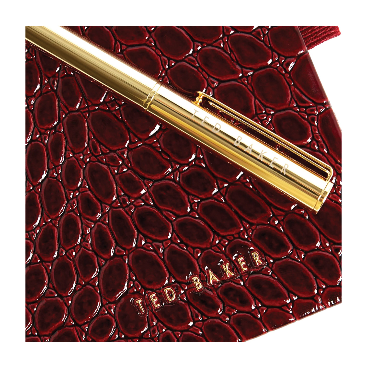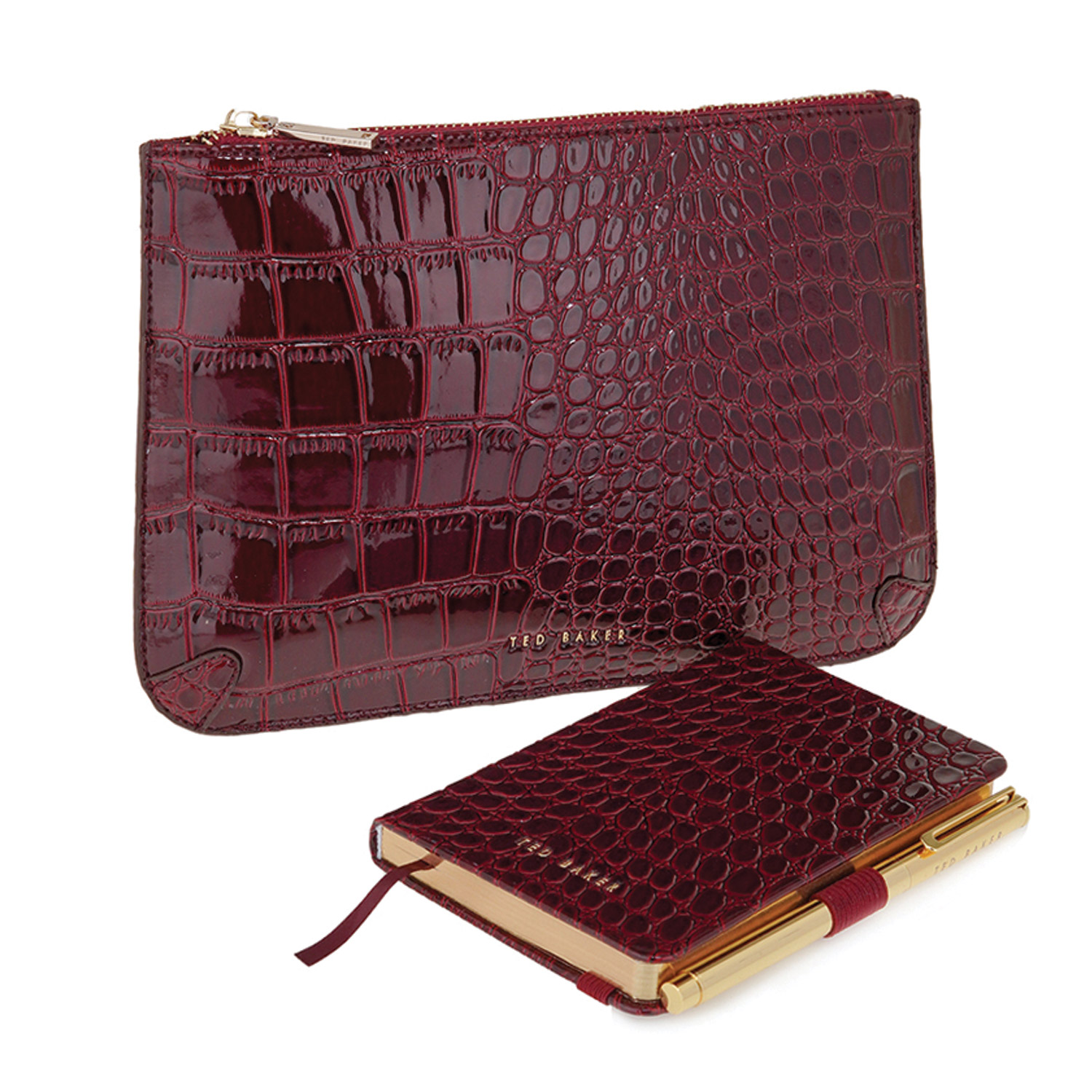 Γυναικείο σετ που περιλαμβάνει pouch bag, τετράδιο και στυλό της Ted Baker. Το τετράδιο διαθέτει διαστάσεις Α6, 192 σελίδες, glossy εξώφυλλο με croco μοτίβο, ελαστικό ιμάντα συγκράτησης και υποδοχή για το στυλό. Το στυλό είναι κατασκευασμένο από ανοξείδωτο ατσάλι με χρυσή απόχρωση. Η pouch bag είναι κατασκευασμένη από faux leather, με μία κύρια θήκη, κλείσιμο με φερμουάρ και λογότυπο μπροστά.