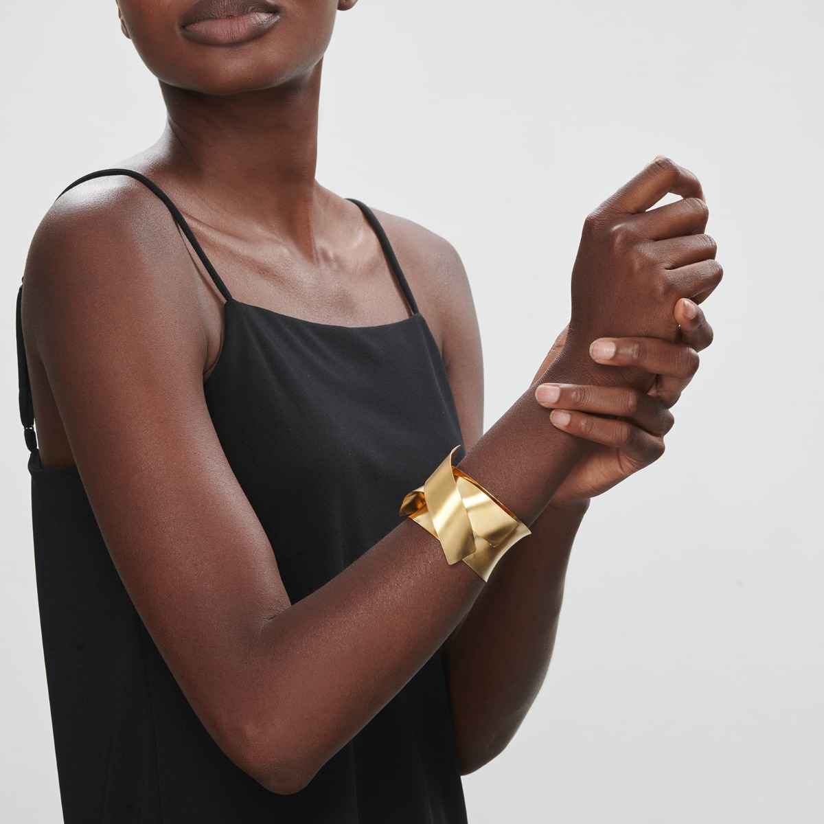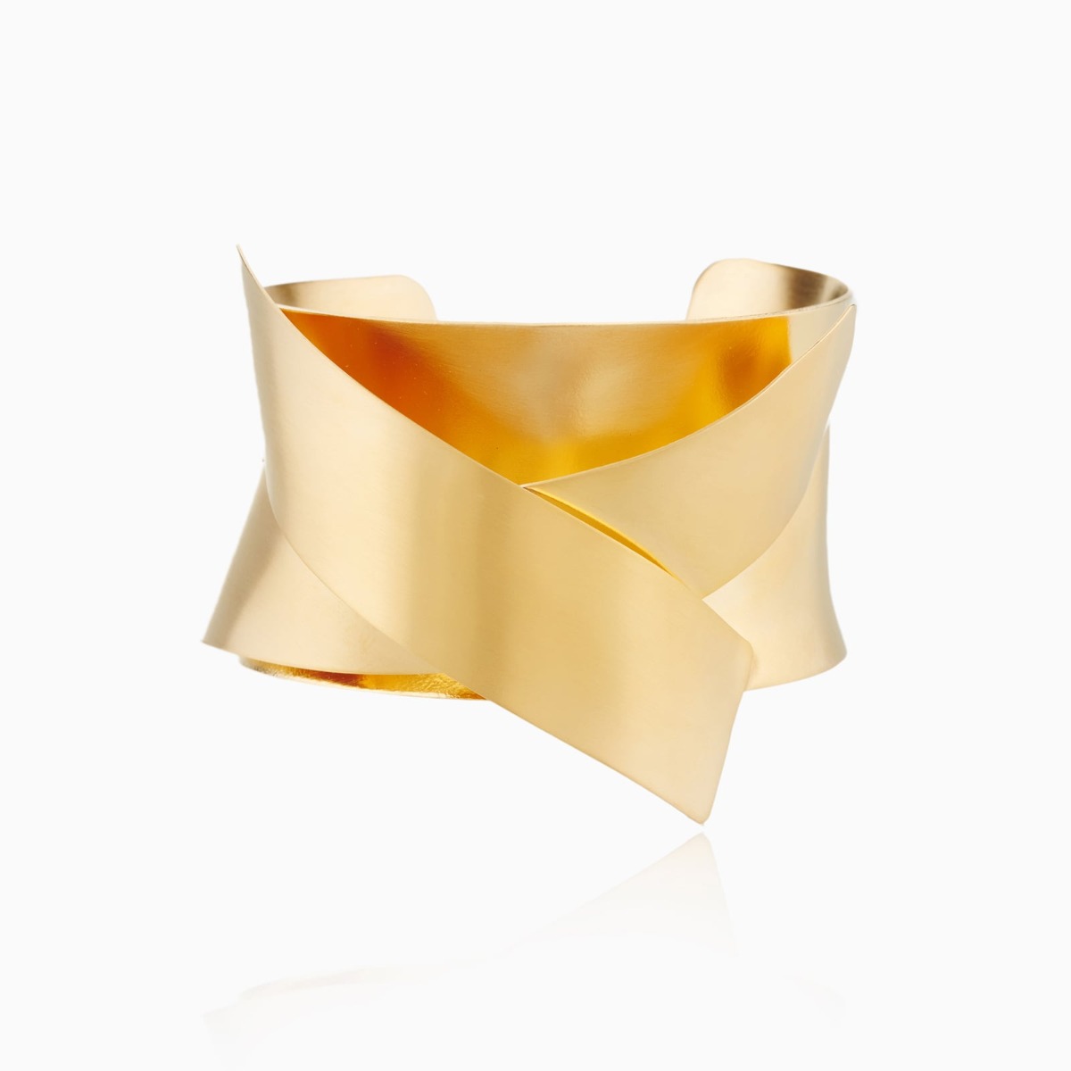 Οι κυρτές ταινίες, μικρά εύκαμπτα ορθογώνια, ουσιαστικά, φτιάχνουν μια ενδιαφέρουσα σύνθεση με ασυμμετρίες που θυμίζουν σύγχρονο γλυπτό. Η λάμψη του μετάλλου πρωταγωνιστεί σε ένα κομμάτι που διακρίνεται για το λιτό και συγχρόνως ελαφρώς gothic στυλ του. •Ορείχαλκος με επιχρύσωση 24k