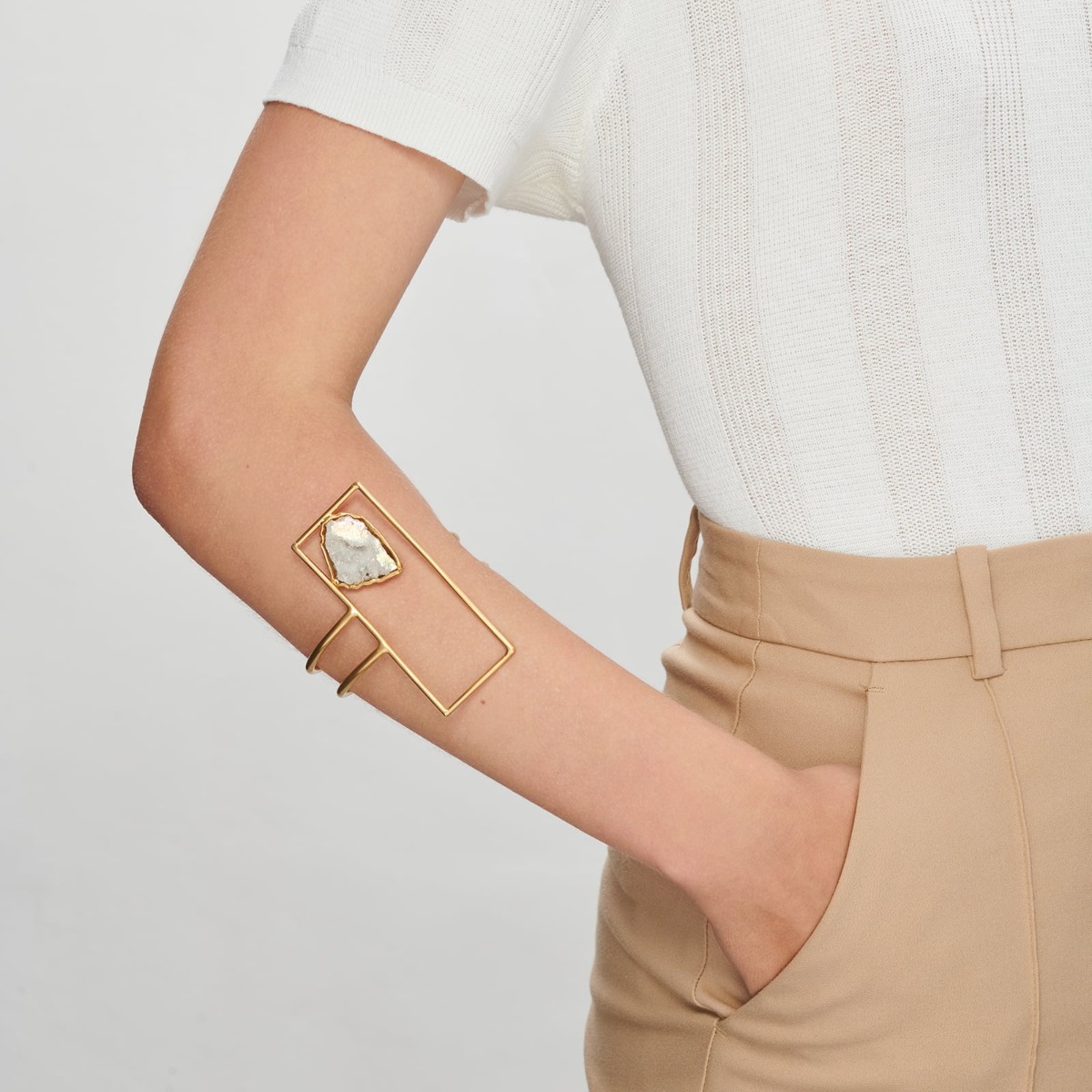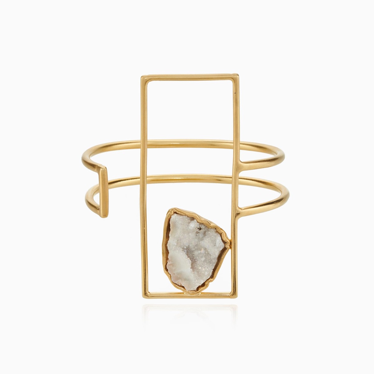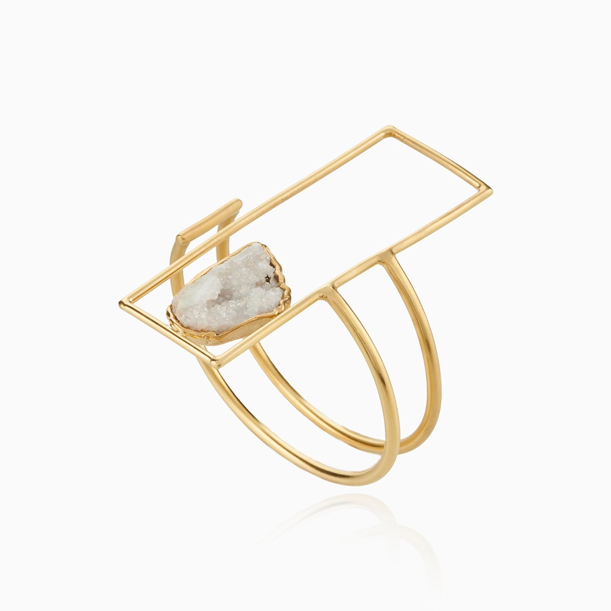 Η τραχιά ομορφιά του αχάτη κλείνεται σε ένα ορθογώνιο στοιχείο για να αναδειχθεί μέσα από την αντίθεση με την αυστηρότητα των γεωμετρικών γραμμών. Ο ημιπολύτιμος λίθος ακουμπά μαλακά στο χέρι, σε ένα πρωτότυπο παιχνίδι υφών και ασυμμετρίας. •Ορείχαλκος με επιχρύσωση 24k •Λευκός αχάτης
