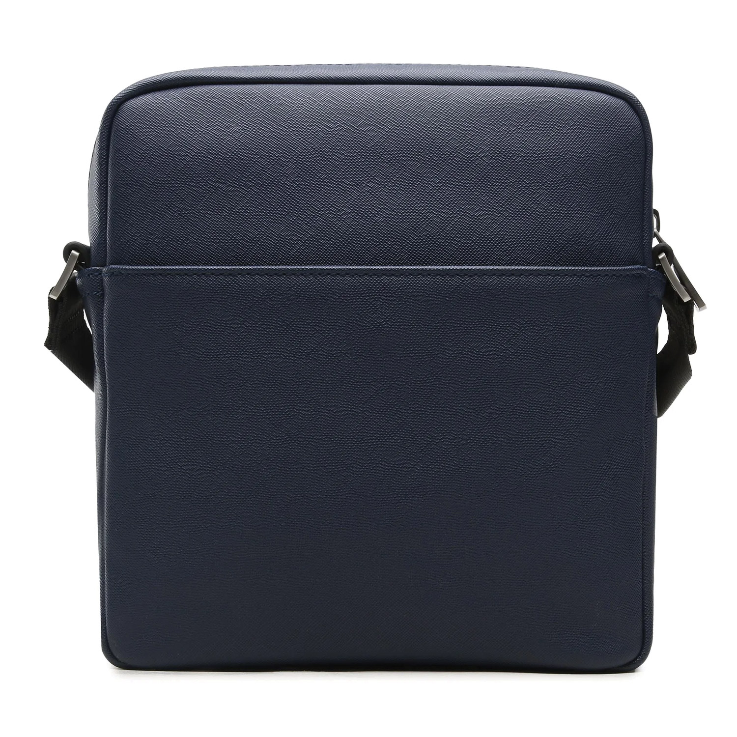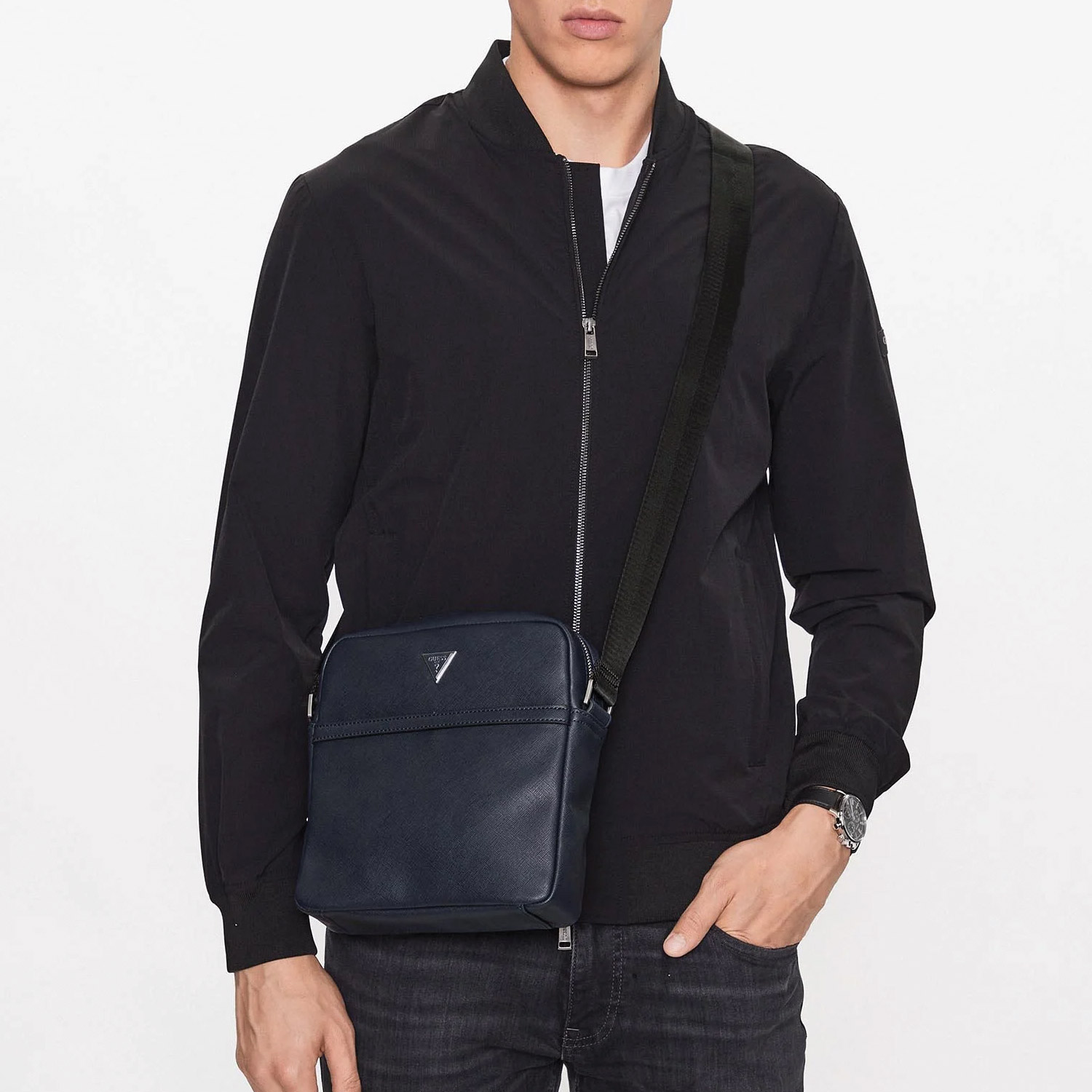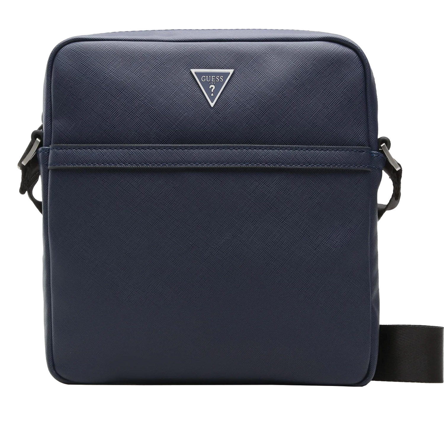 Guess ανδρική τσάντα χιαστή, σε μπλε χρώμα, κατασκευασμένη από οικολογικό δέρμα. Ύψος 23.5εκ., Μήκος 22εκ.