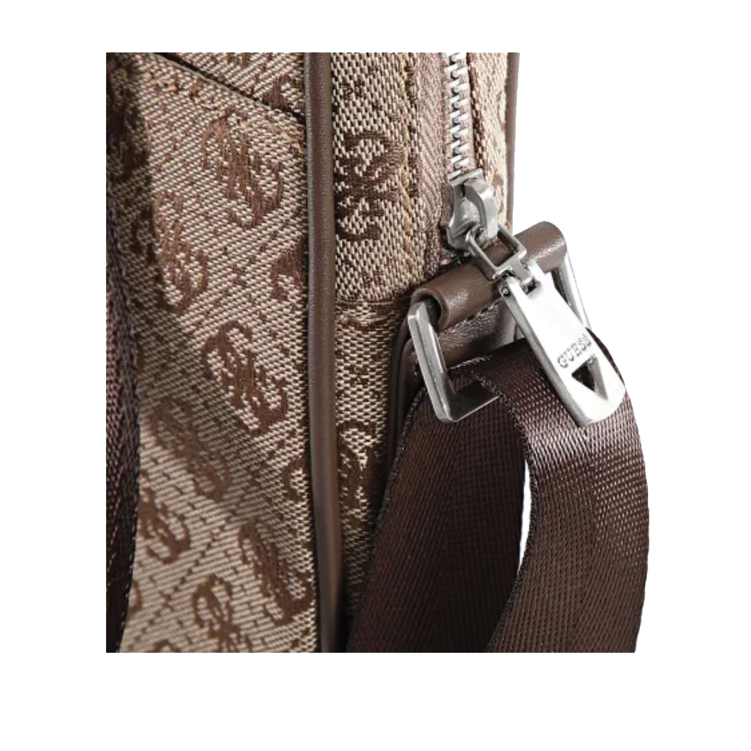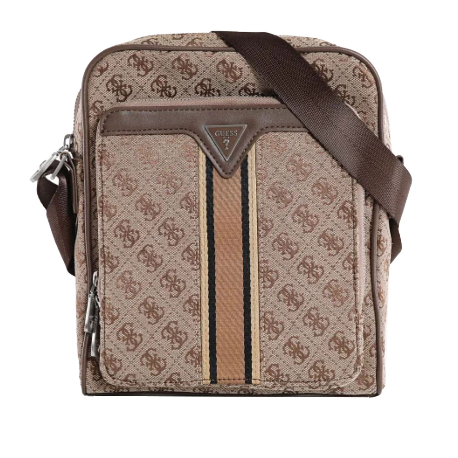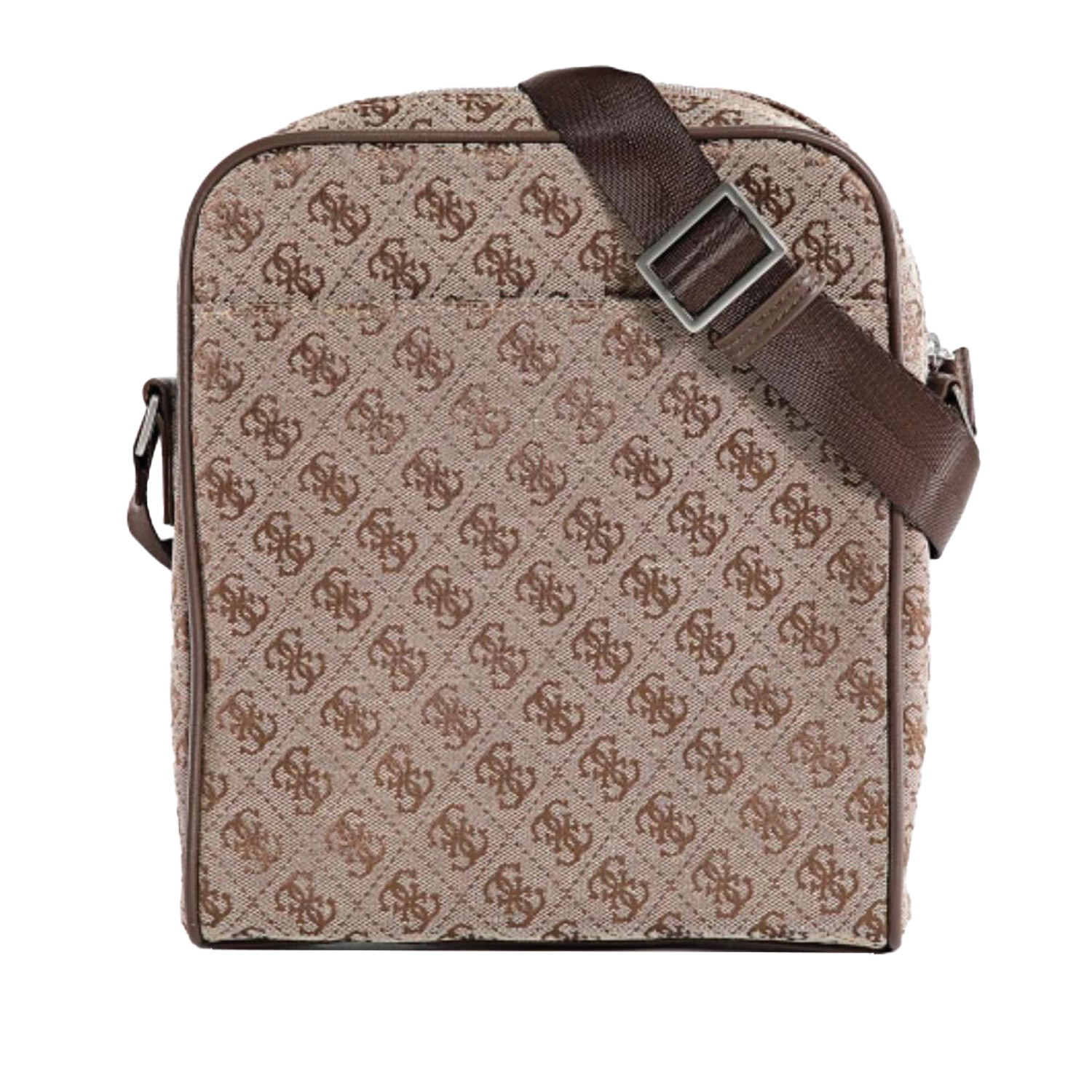 Guess ανδρική τσάντα χιαστή, σε μπεζ χρώμα, κατασκευασμένη από οικολογικό δέρμα και ύφασμα. Ύψος 25εκ., Μήκος 21εκ.