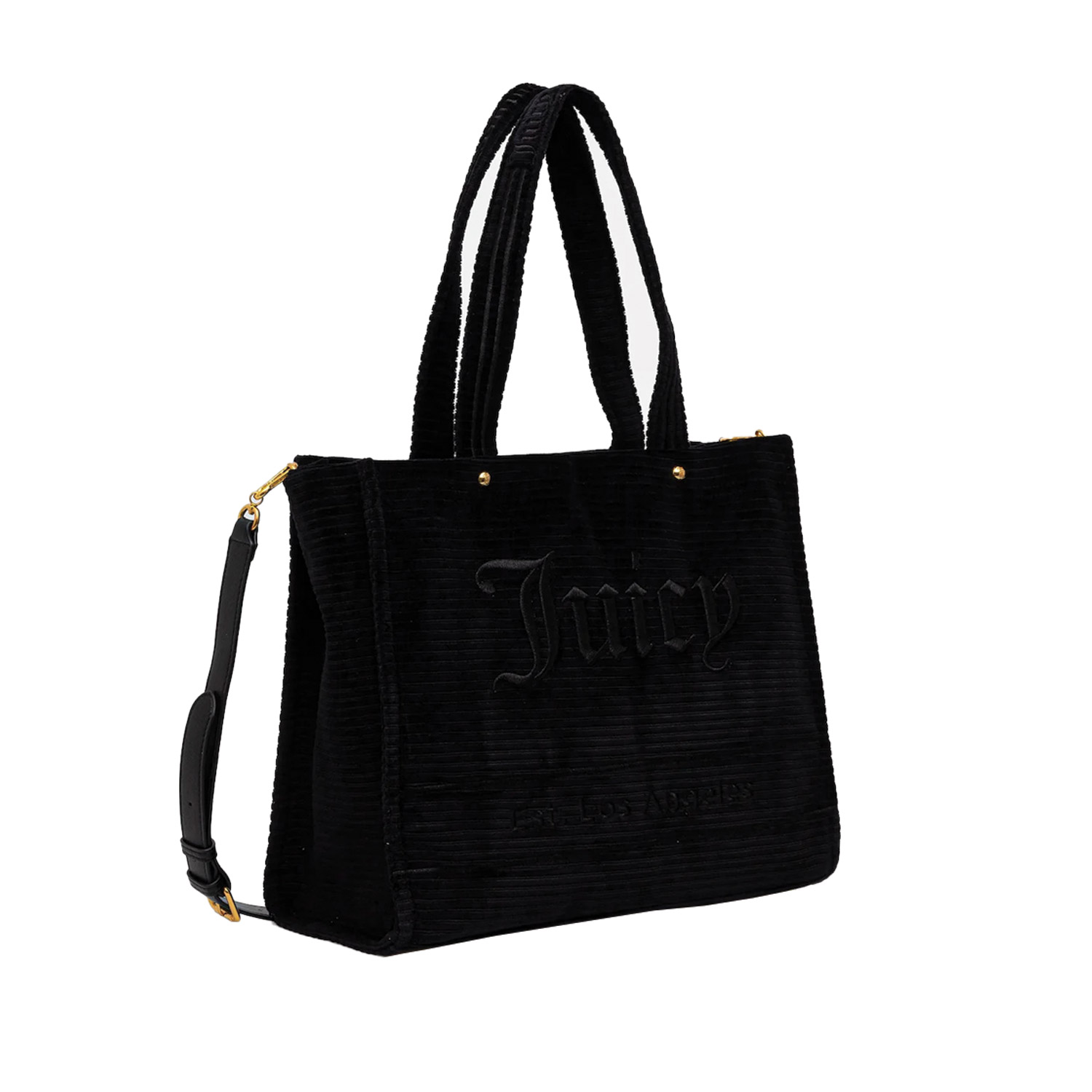 Juicy Couture γυναικεία τσάντα ώμου, σε μαύρο χρώμα, κατασκευασμένη από 70% βαμβάκι, 20% πολυεστέρας, 10% πολυουρεθάνη. Ύψος 30εκ., Μήκος 36εκ.