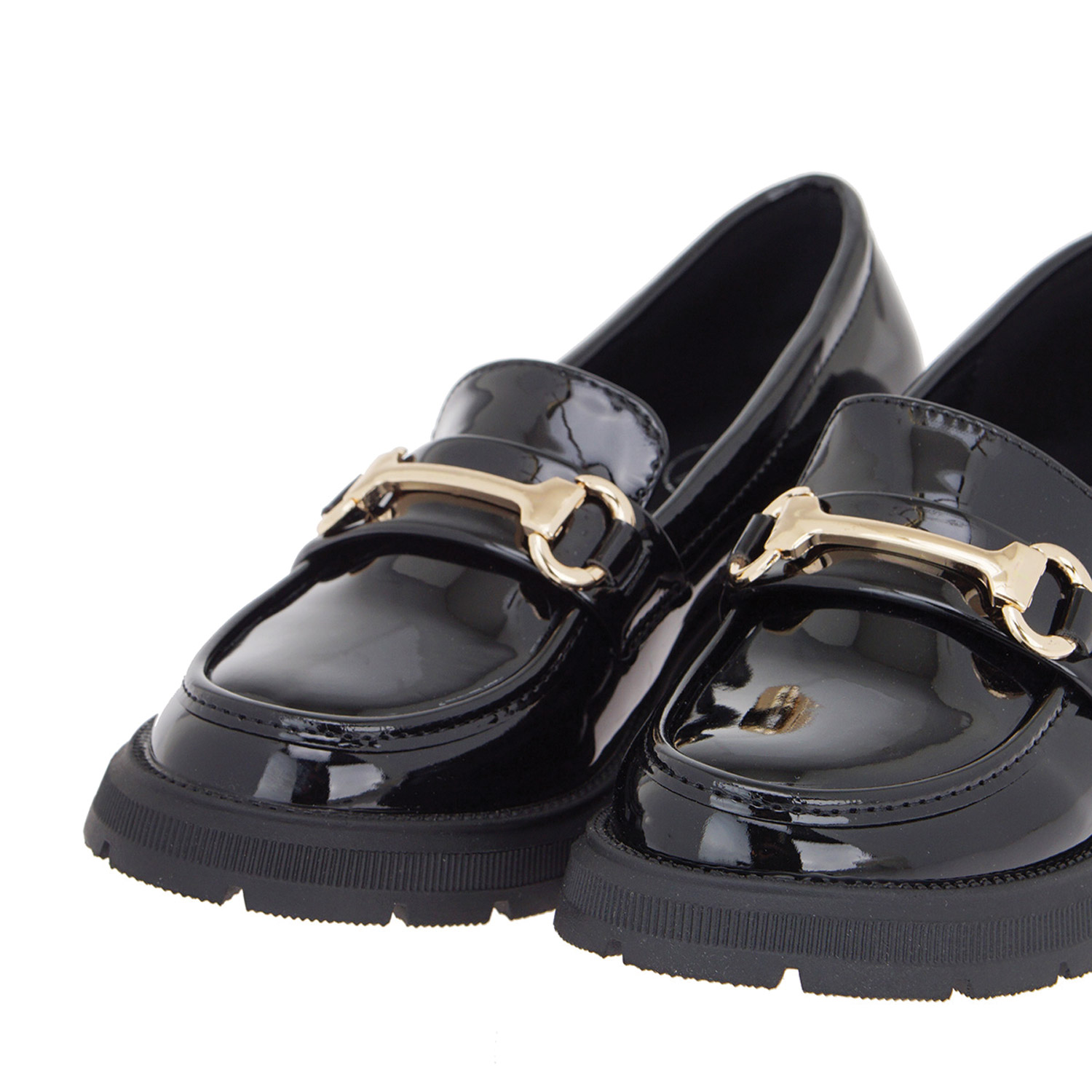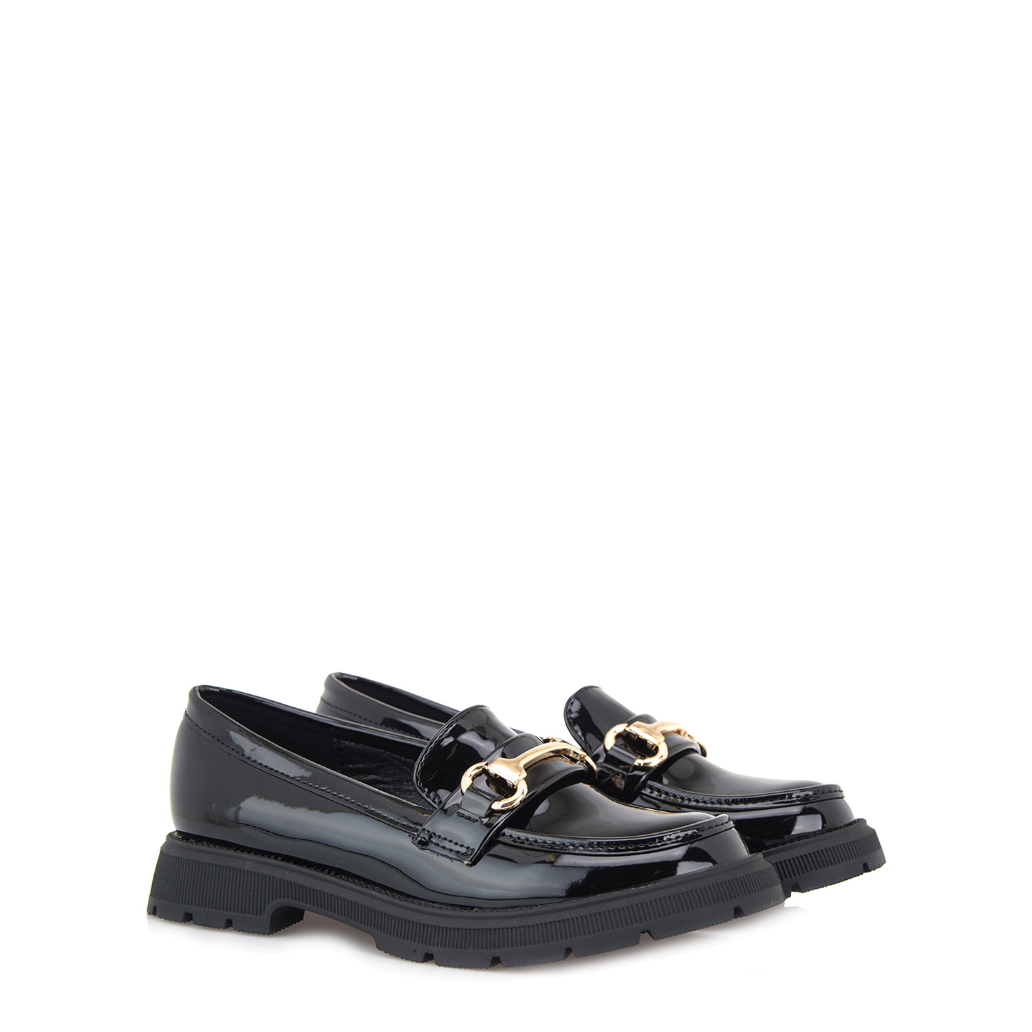 Exe παιδικό loafer, σε μαύρο χρώμα, κατασκευασμένο από λουστρίνι. Ύψος σόλας 3εκ.