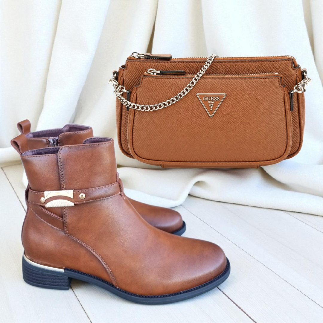 Σετ γυναικείο με έκπτωση. Αποτελείται από Koniarisshoes γυναικείο μποτάκι και Guess γυναικεία τσάντα χιαστή.