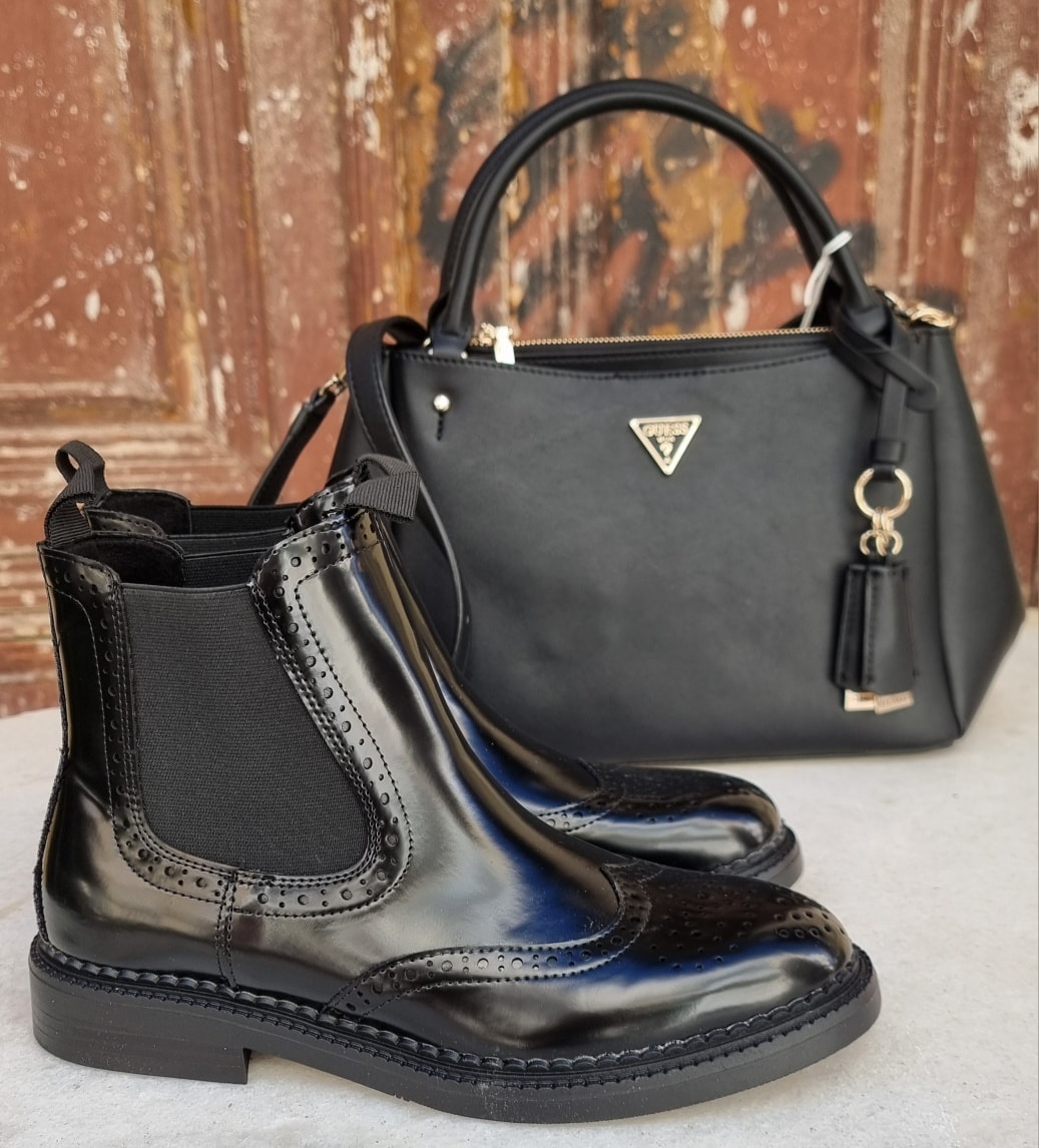 Σετ γυναικείο με έκπτωση. Αποτελείται από Koniarisshoes γυναικείο μποτάκι και Guess γυναικεία τσάντα χειρός.