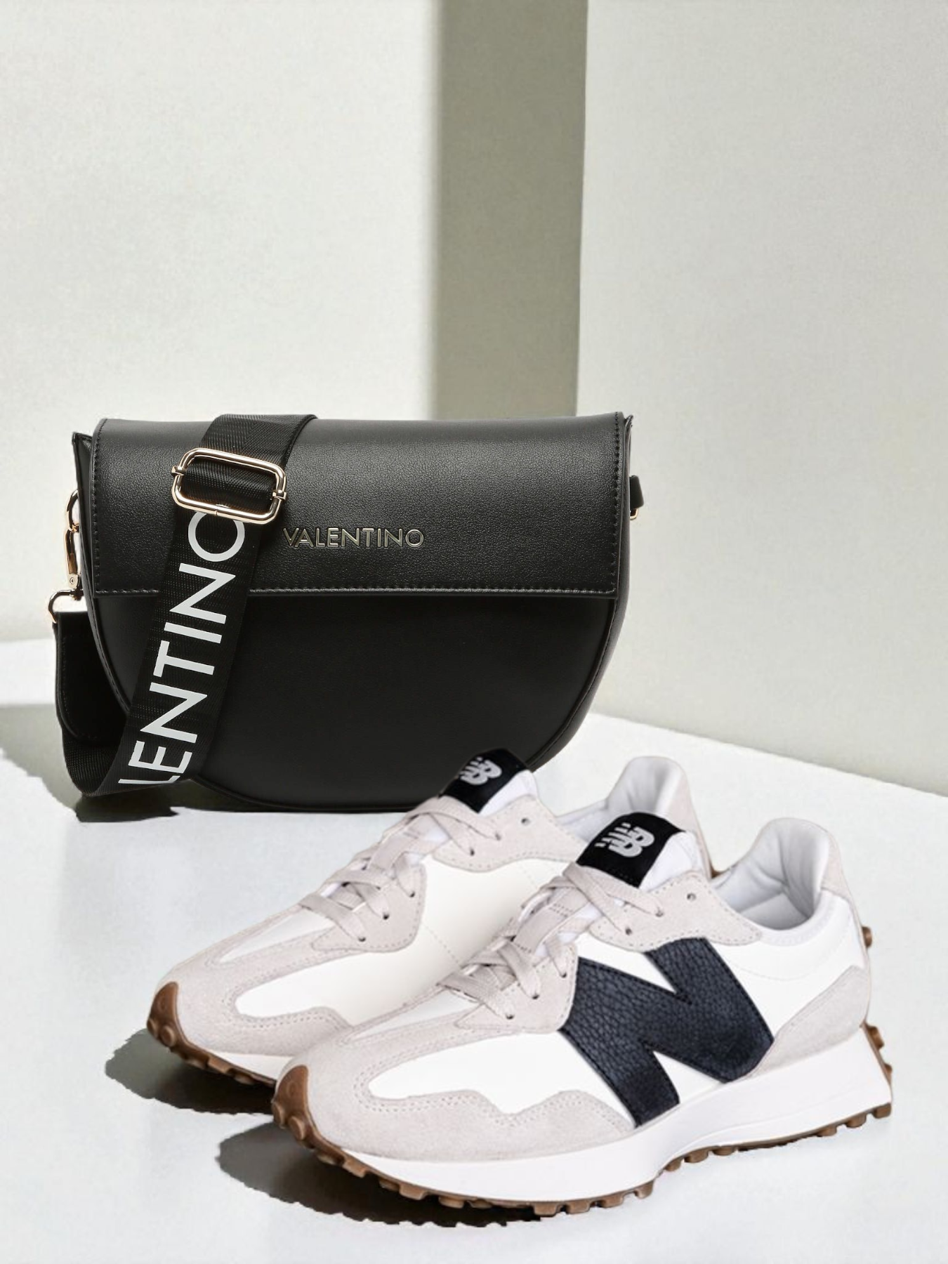 Σετ γυναικείο με έκπτωση. Αποτελείται από Valentino γυναικεία τσάντα χιαστή και New Balance 327 γυναικείο sneaker.