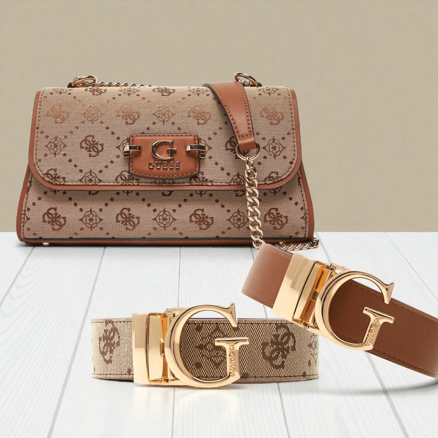 Σετ γυναικείο με έκπτωση. Αποτελείται από Guess γυναικεία τσάντα ώμου και Guess γυναικεία ζώνη.