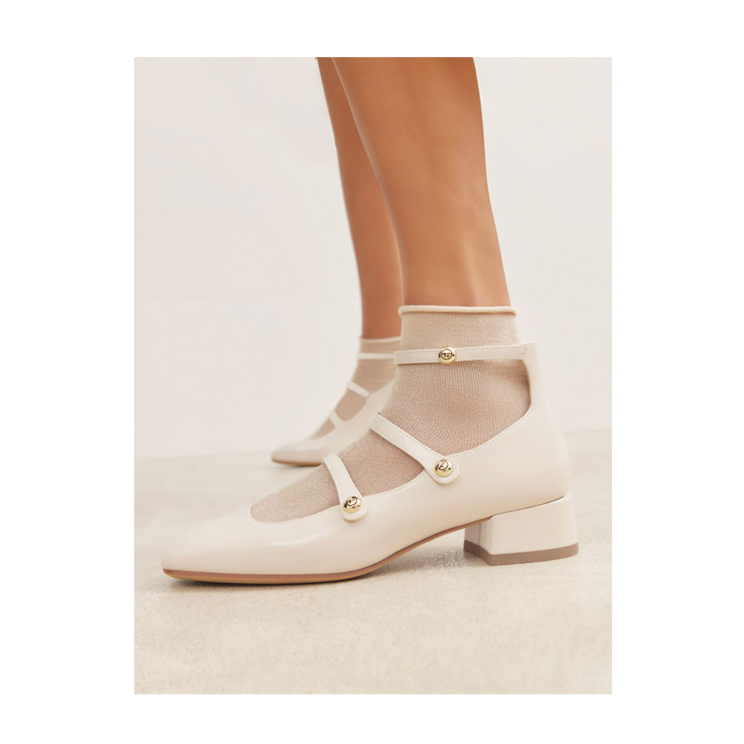 Tamaris κάλτσες, σε λευκό-πορτοκαλί χρώμα, κατασκευασμένες από 45 % πολυαμίδιο, 20% πολυεστέρας, 18% βαμβάκι, 14 μεταλλικό νήμα, 3% ελαστάνη.
