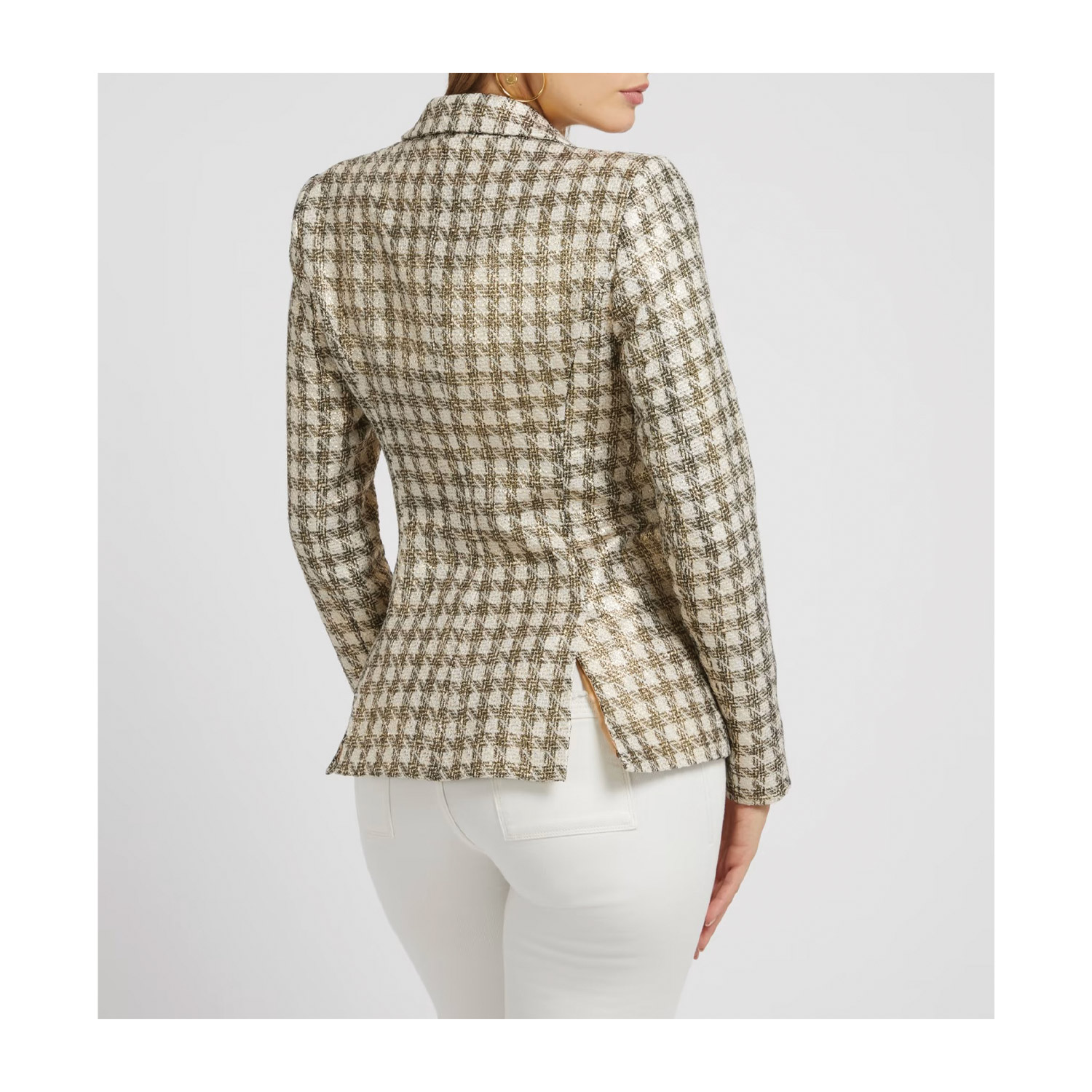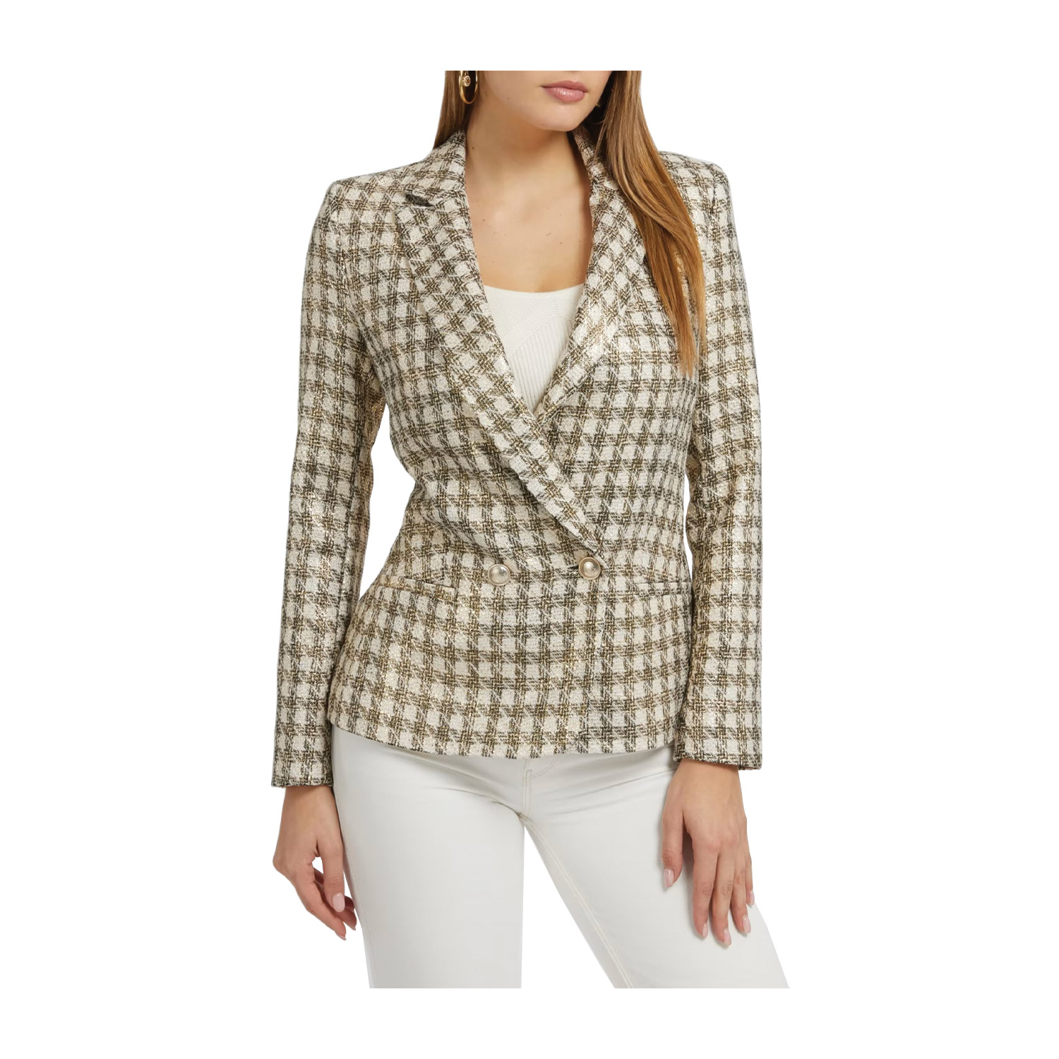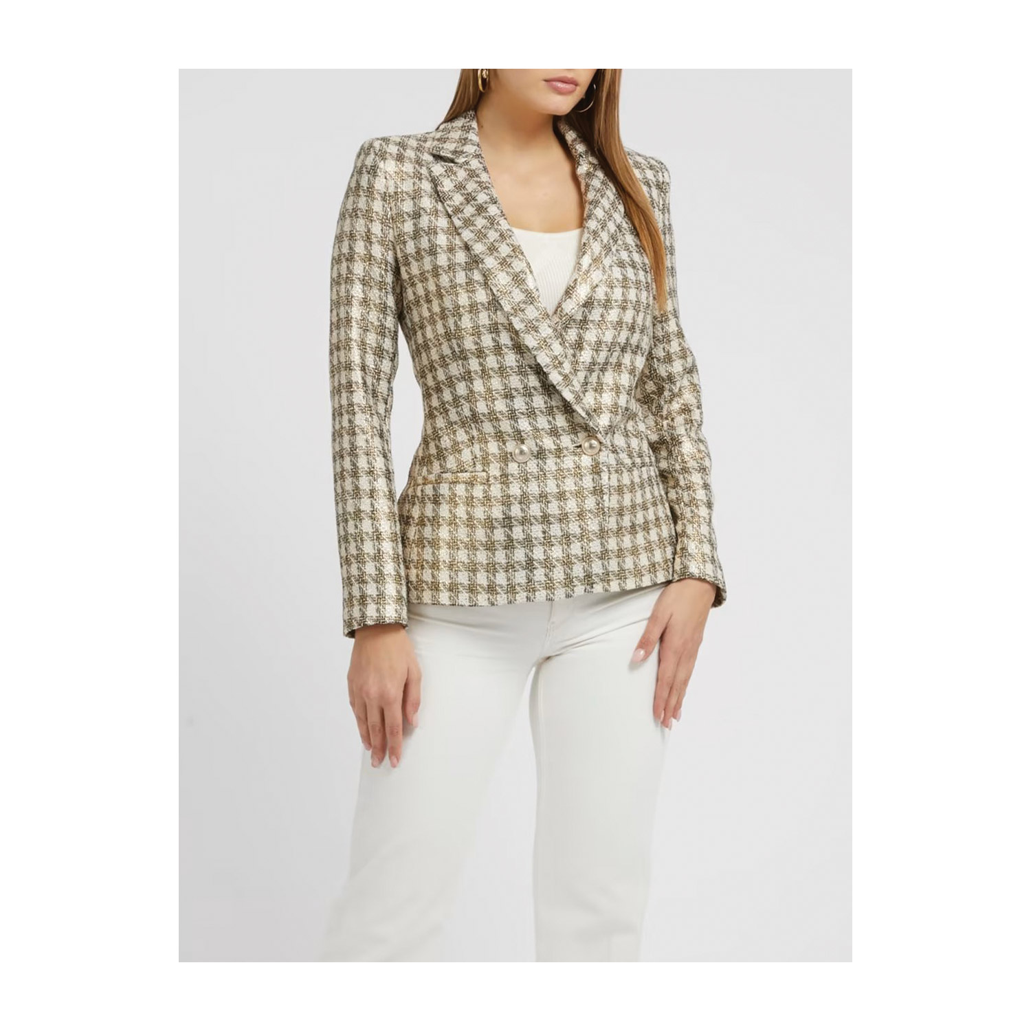Guess γυναικείο σακάκι, σε μπεζ χρώμα, κατασκευασμένο από 39% ακρυλικό, 27% πολυεστέρα, 27% βαμβάκι, 7% βισκόζη.